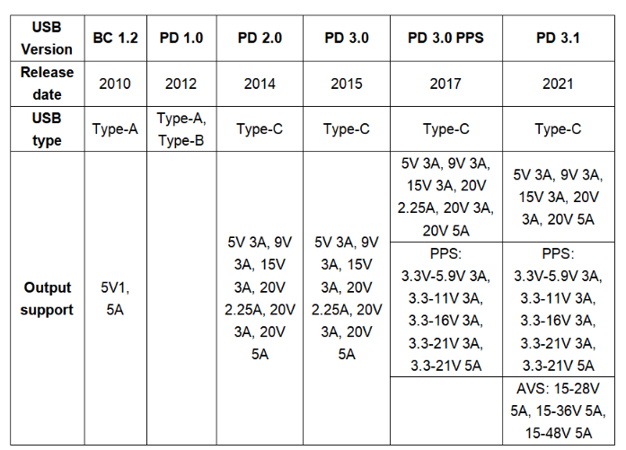 By default, the USB Type-C interface supports up to 5V and 3A (i.e., 15W), which is suitable for powering common low-power devices. To meet the needs of higher-power devices, the USB Power Delivery (PD) specification was introduced. The latest USB PD 3.2 version significantly increases power delivery capability, allowing up to 240W over a single USB Type-C cable, greatly expanding the application range of USB-C. Note that for voltages of 20V and power above 60W, the current is limited by cable specifications.