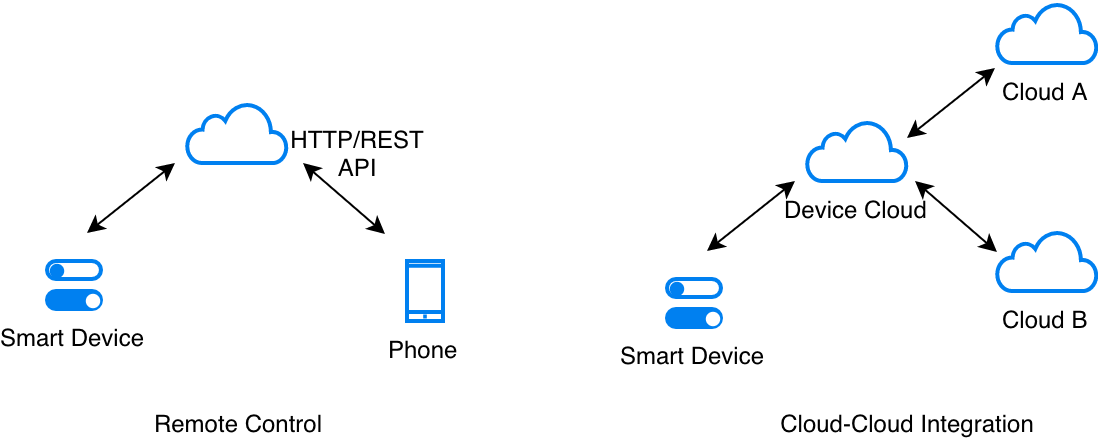 In most cases, once a device is connected to the cloud, the Device Cloud platforms expose the device control and monitoring through a RESTful web API. Authenticated clients, like smartphone apps can use these APIs to access the device remotely.