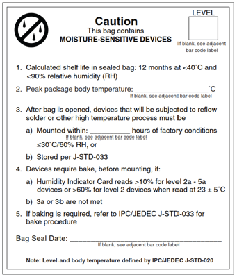 All Espressif chip’s moisture sensitivity level (MSL) is 3, thus must be dry-packed. Dry packing usually consists of desiccant material, a humidity-indicator card (HIC), as well as a Moisture Sensitivity Caution Label sealed with the populated reel inside a moisture barrier bag (MBB).