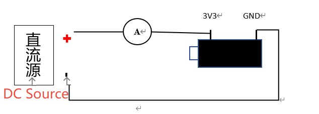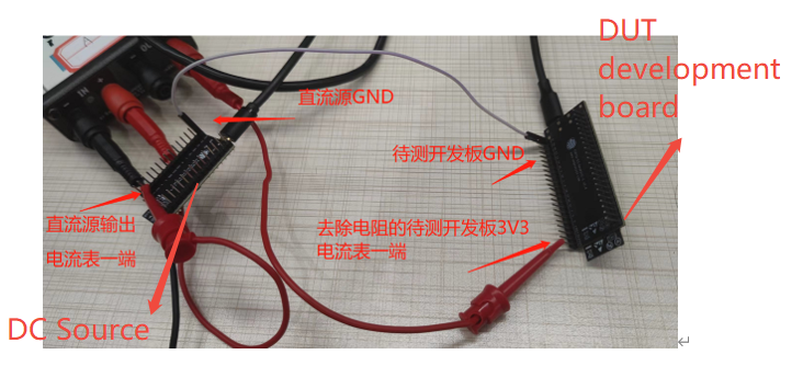 Step 2: After removing the resistor, connect one end of the ammeter to the 3V3 DC source input, the other end to the 3V3 pin of the development board, and connect the GND of the development board to the GND of the DC input source, as shown in the following wiring diagram:
