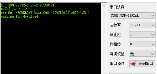 After powering on the ESP32-C5 chip/module, you can use the PC-side serial debugging software to view the UART0 serial output at chip power-on to confirm whether the chip has entered download mode. If the chip powers on and enters download mode, UART0 will print the following log: