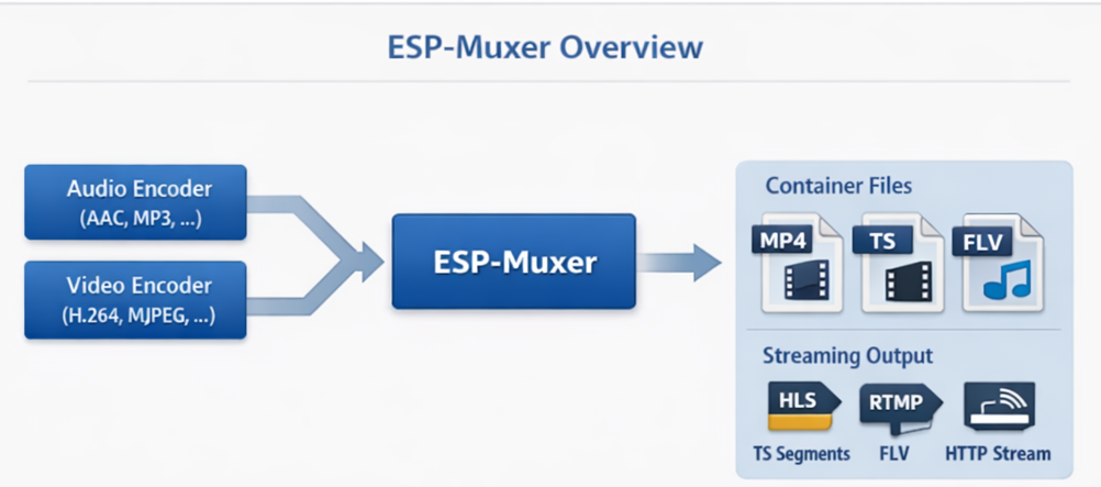 ESP-Muxer is an embedded audio and video multiplexing component launched by Espressif, used for multiplexing (mux, multiplexing) encoded audio and video frames (such as AAC, MP3, H.264, MJPEG) into a data stream or file in a standard media container format. It is not responsible for the encoding or decoding of audio and video, but only for the temporal organization and encapsulation of the input encoded frames.
