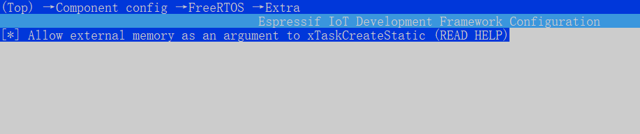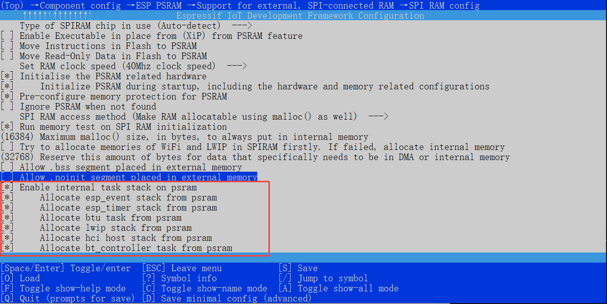 menuconfig中依次选择Component config → ESP PSRAM → Support for external, SPI-connected RAM → SPI RAM config,使能如下配置项,将内部任务栈分配到 PSRAM。