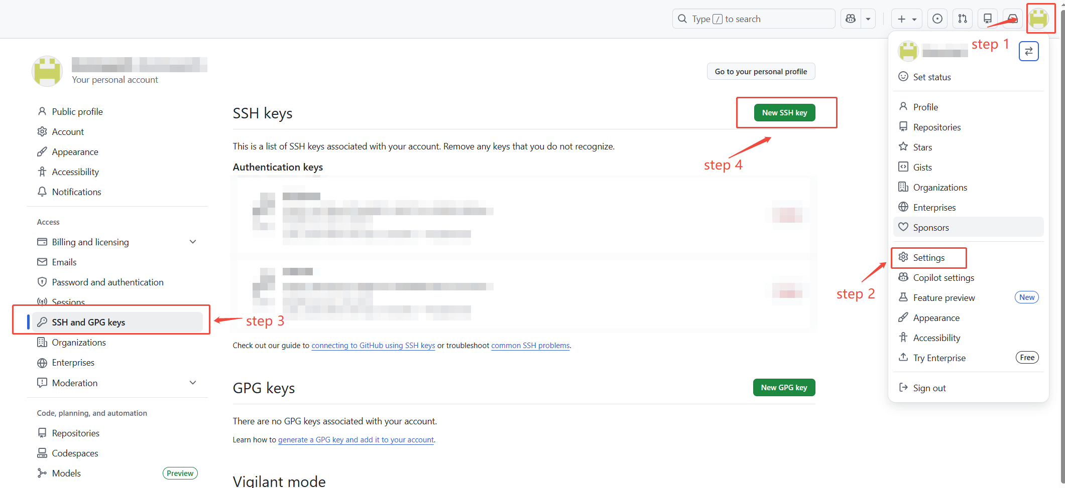 Settings>SSH and GPG keys>New SSH key。