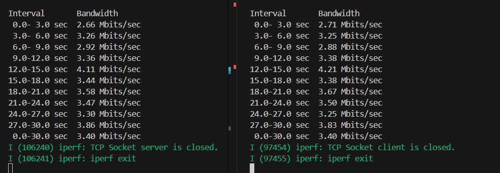 ESP32 设备间测试时,作为客户端和服务器的 ESP32 设备都会打印 Bandwidth。下图中左边为服务器数据,右边为客户端数据。