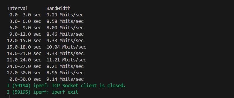 iperf -c <IPv4> -i 3 -t 30
