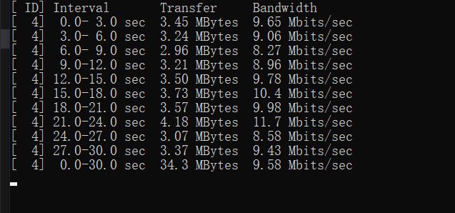 -u表示开启 UDP 模式-c表示开启 Client 模式<IPv4>表示服务器设备的 IP 地址,用于客户端连接-t 30表示总共测试 30 秒时间-i 3表示每 3 秒打印一次速率