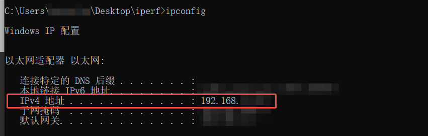 在测试时,电脑作为服务器,首先需要在 cmd 中输入 ipconfig 获取电脑的 IPv4 地址: