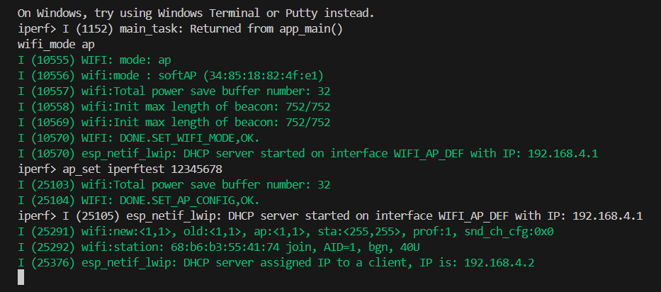 在测试时,需要将一台 ESP32 设备配置为 AP 模式,并指定其 SSID 和密码,作为 iPerf 服务器 使用: