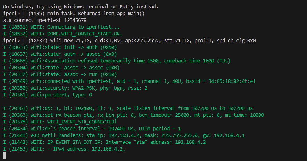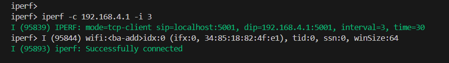 在 ESP32 设备端运行 iPerf,作为 客户端 使用: