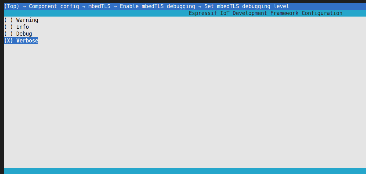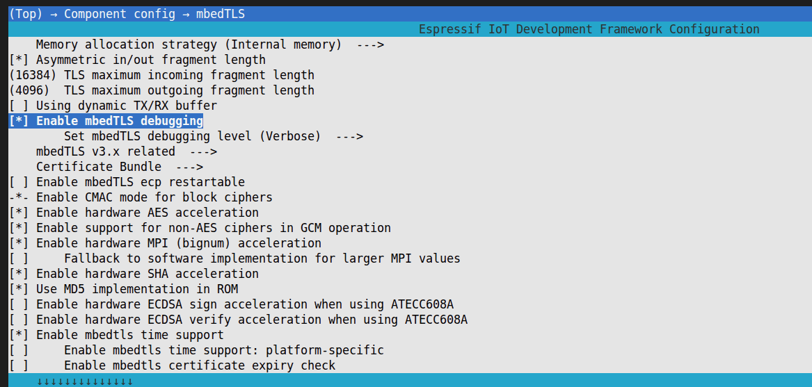 menuconfig后依次选择Component config > mbedTLS,按空格开启Enable mbedTLS debugging