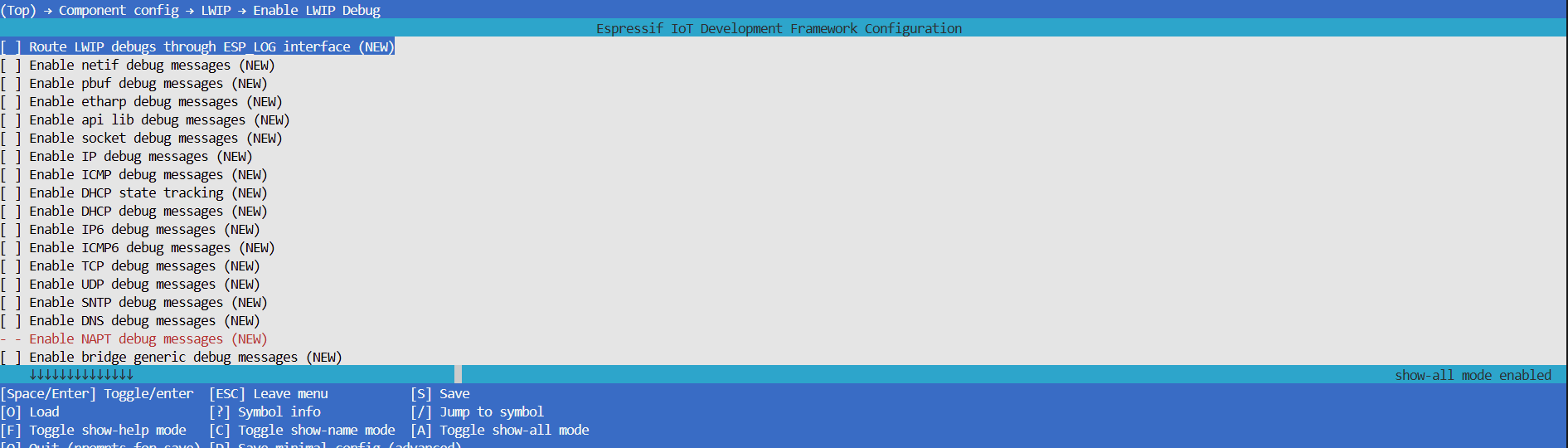 menuconfig后依次选择Component config > LWIP,按空格开启Enable LWIP Debug