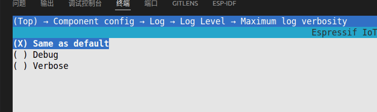 menuconfig后依次选择Component config > Log > Log Level > Maximum log verbosity,勾选DEBUG选项后保存配置。