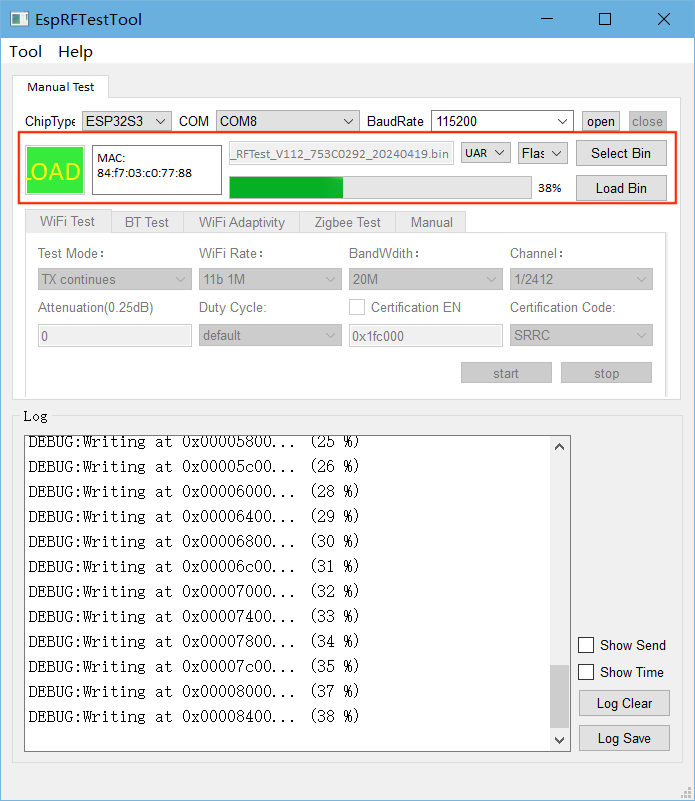 EspRFTestTool 工具包主界面就是 EspRFTestTool 工具,包含串口配置区、下载配置区、射频测试配置区,以及 log 窗口。