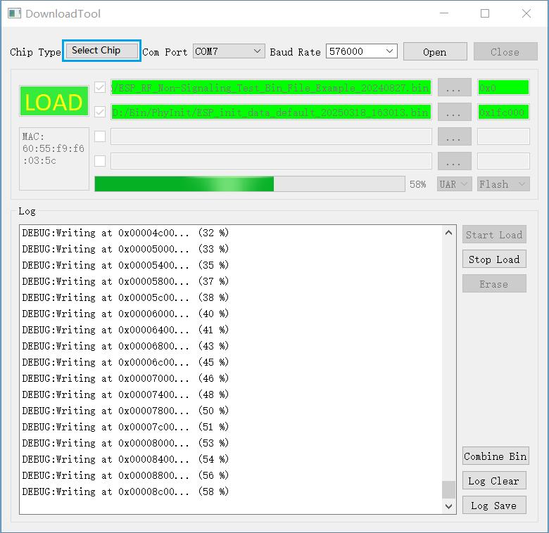 Load Bin即可开始烧录;烧录完成后,拉高 Boot 管脚对芯片重新上电使芯片进入工作模式。