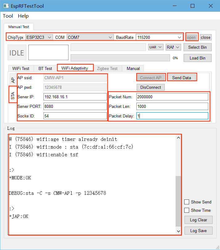 ChipType与COM,波特率选择 115200,打开端口后,选择WiFi Adaptivity测试界面。在