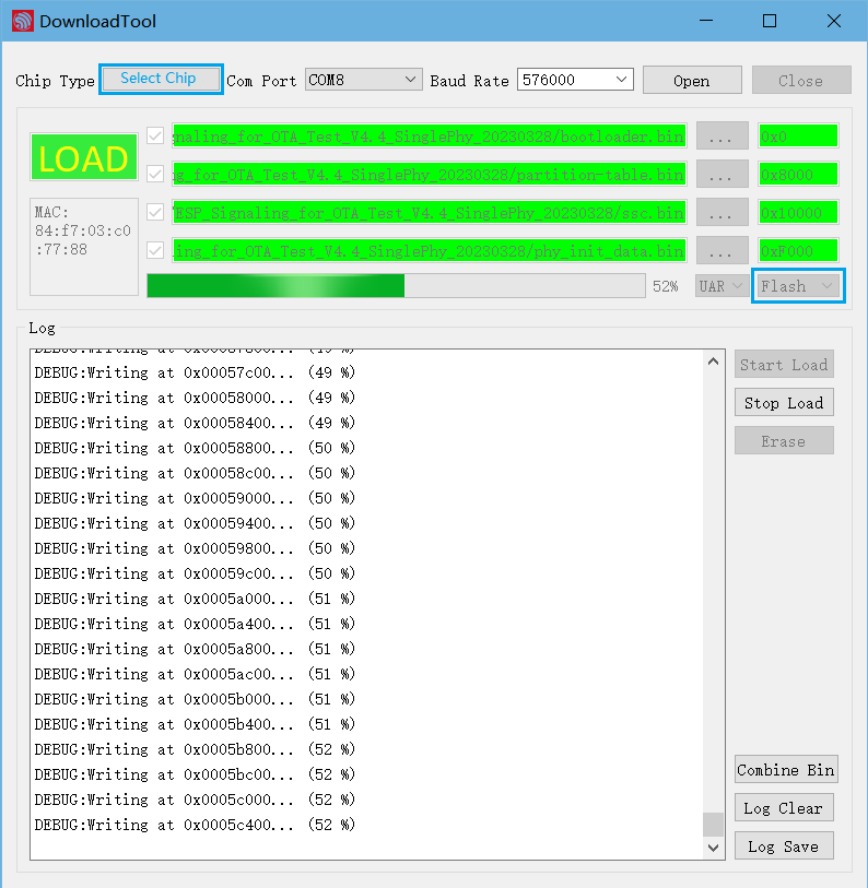 ChipType,Com Port,Baud Rate,点击Open,选择下载到Flash。ESP32-C2 Wi-Fi 信令测试固件(单国) 支持单国国家码,ESP32-C2 Wi-Fi 信令测试固件(多国) 支持多国国家码。它们分别都包括 bootloader.bin, partition-table.bin, phy_init_data.bin 与 ssc.bin 4 个 bin 文件。