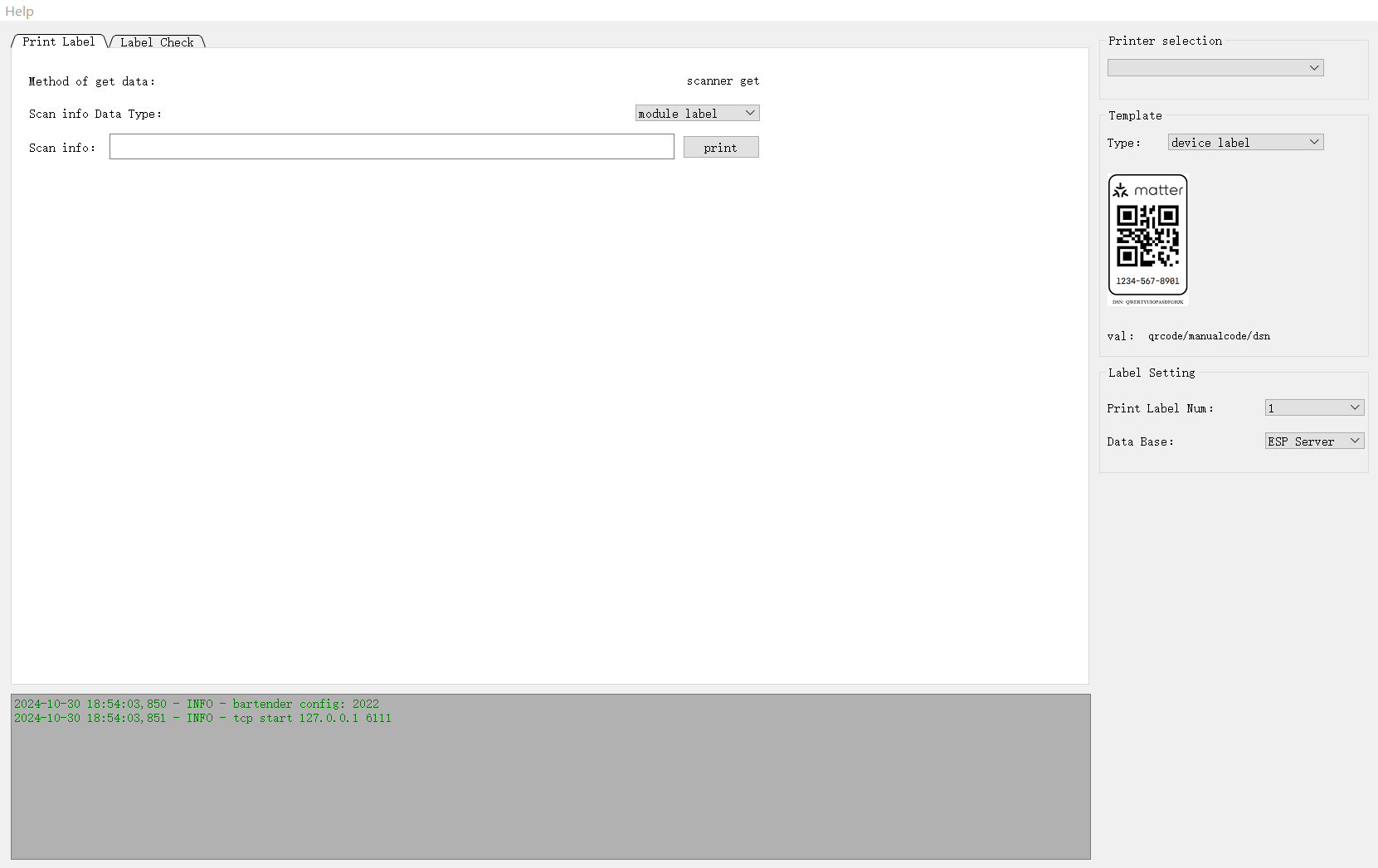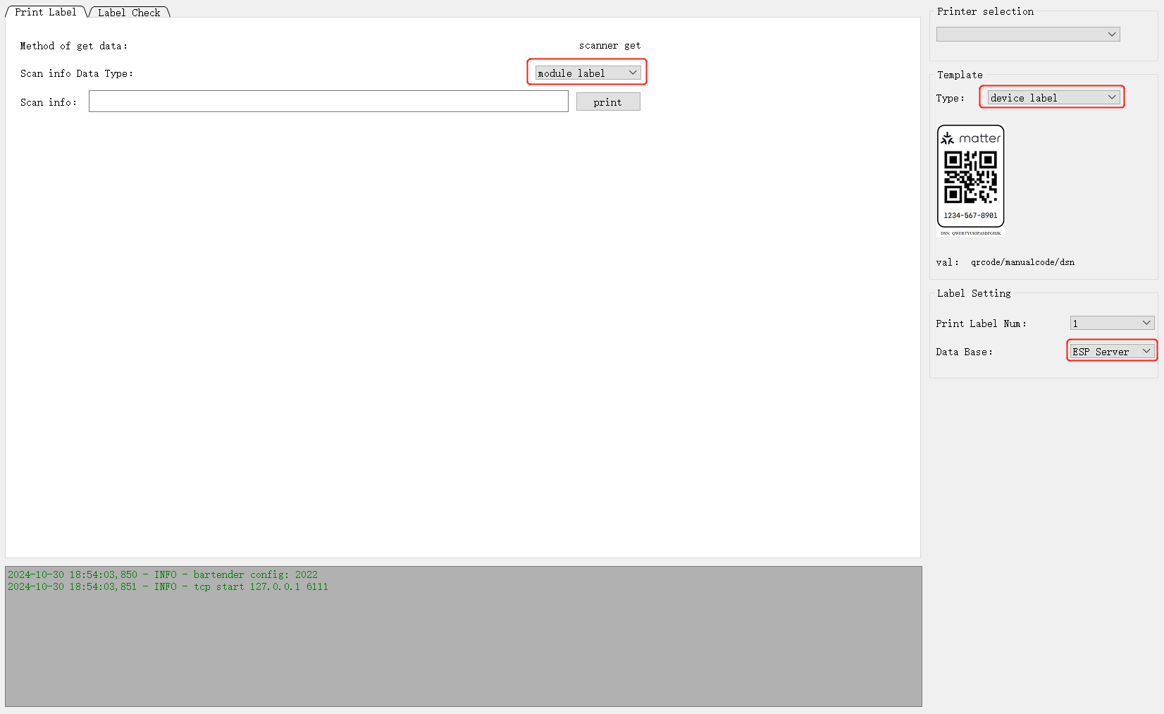 Printer selection:默认显示系统打印机,可根据需要选择对应打印机Template:选择打印使用的模板文件Method of get data: 设备信息的获取方式Scanner get: 使用扫码枪Scan info Data Type: 扫码枪扫描内容的格式Module label: 乐鑫模组屏蔽盖二维码Device label:已打印出的设备标签MAC:乐鑫产品的 MAC 地址