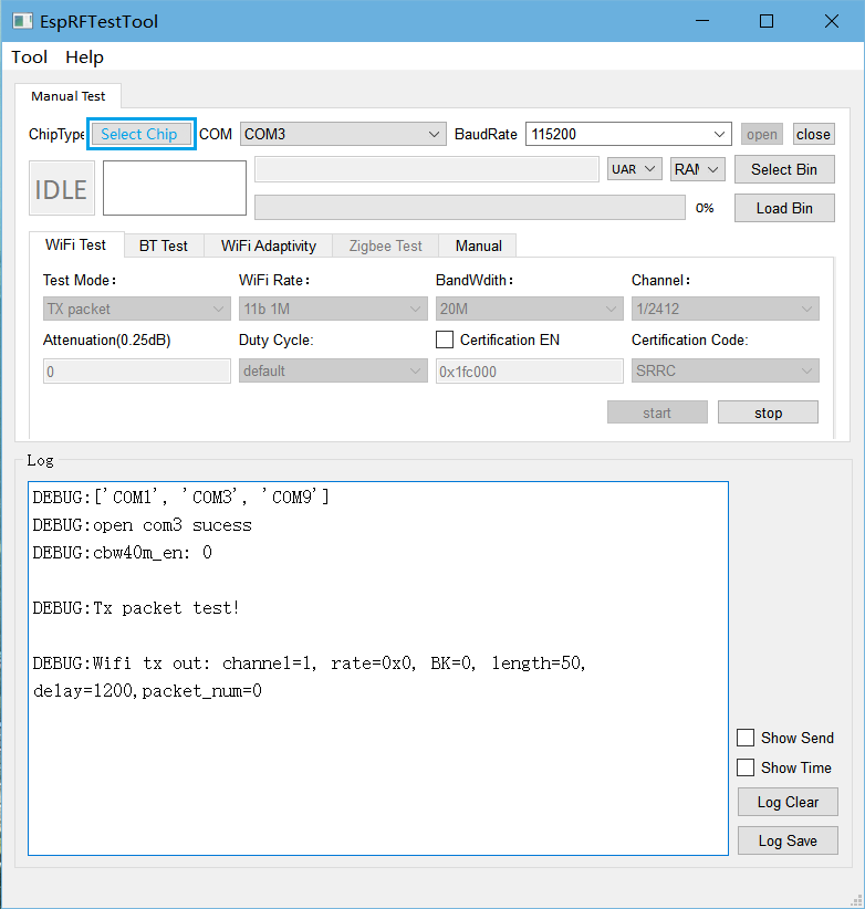 点击 start 后,仪器在测试信道发包,完成后点击 stop,在 log 窗口中应显示类似如下收包信息: