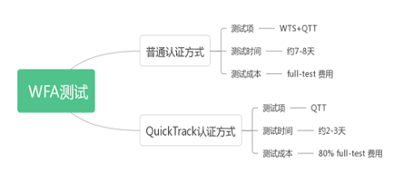 此处的测试时间仅指测试部分的时间,WFA 完整认证流程包括提交和审批,可能需要长达 40 天的时间。QuickTrack 可以将整个流程缩短至约 10 天,节省约 70% 的时间。