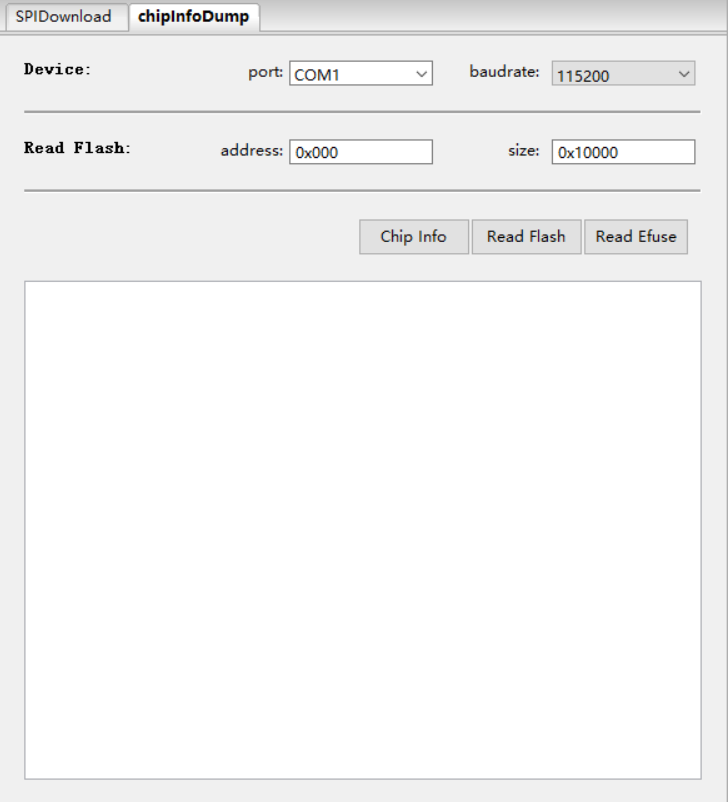 Chip Info:读取芯片型号、flash ID 以及 flash 状态寄存器值,读取内容直接显示在软件界面上。Read Flash:读取 flash 存储的数据。读出的内容会存储在生成的 bin 文件中,bin 文件名称以“芯片 MAC + 读取起始地址 + 读取数据长度 + 读取时间”的格式命名。Read Efuse:读取芯片 eFuse 的内容,功能和esptool summary 相同,读出内容存储在生成的文本文件中,文件以“芯片 MAC + 读取时间”的格式命名。